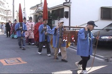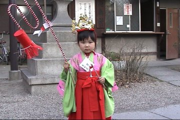 神事を始めるにあたって、まず生贄役となる七人の「官女」を迎えるための行列が社を出発し、正装した童女たちを伴って戻ります。